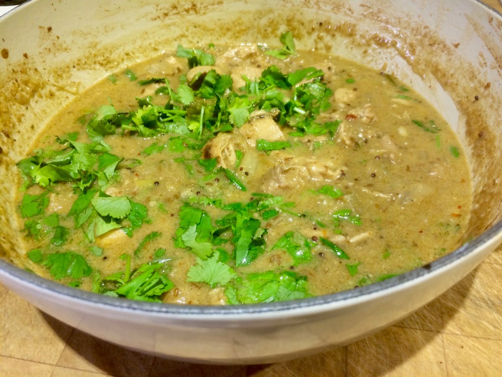 To tell the truth, this is a bit of a mongrel curry I made up when I was defrosting my fridge freezer and needed to use up a pack of chicken and some lemongrass stalks I found in there. I just added some store cupboard basics that I always have around like coconut cream and spices but it is no less fabulous for that. You can also make the sauce and add leftover cooked chicken or turkey at Xmas for a lovely curry feast. It looks like a long list of ingredients but it is very simple to prep and cook. Serve with jasmine or basmati rice. Serves three easily or four if you use a pack of eight chicken thighs.