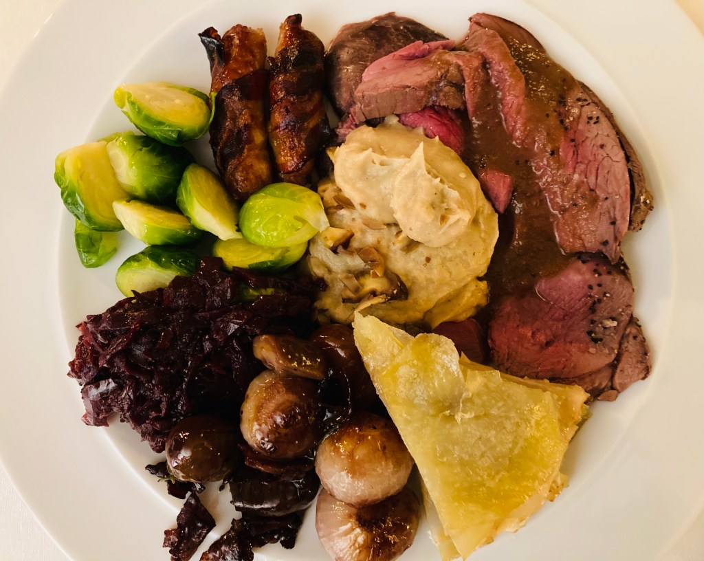 - Pigs in Italian blankets (your favourite baby pork sausages wrapped in pancetta slices and oven-roasted – I use Sainsbury’s Taste the Difference range)