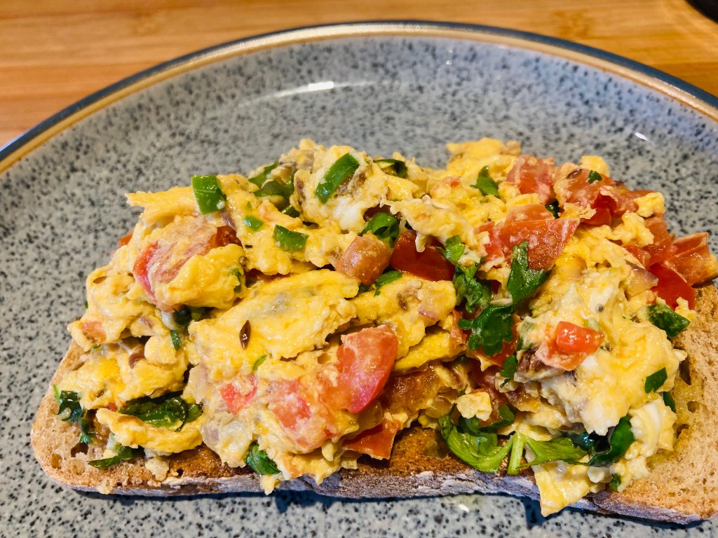 These delicious spicy scrambled eggs are eaten all over India, although we first came across them at Dishoom in London. They make an excellent quick lunch for one or you could make a big batch for Sunday brunch with grilled tomatoes, Masala baked beans (your fave baked beans with a little hot curry paste stirred in) and some crisp bacon on the side. It is officially now my favourite way to eat eggs!