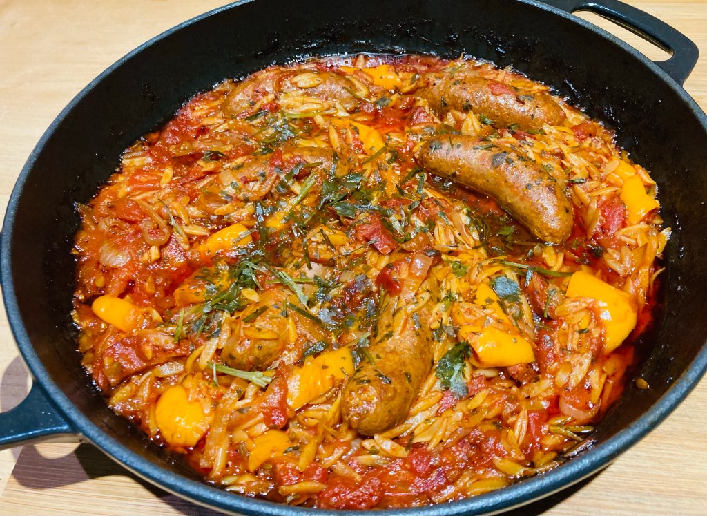 - The sauce should be thick, the orzo will plump up and the sausages should be tender. Garnish with chopped parsley and serve.